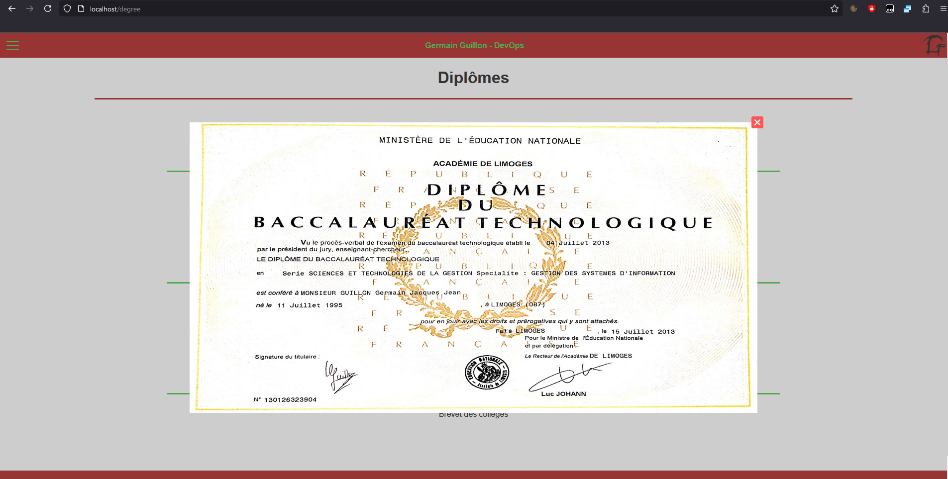 Avant la fin de mon BTS, j'ai mis en ligne mon site sous le domaine https://guillongermain.fr.